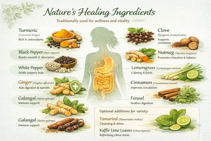 Crafted using authentic botanicals such as turmeric, ginger, galangal, and lemongrass—without artificial flavors or additives.